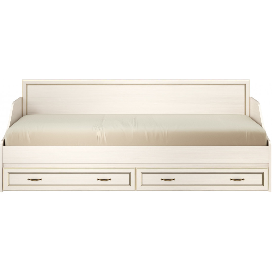 Коллекция производится в текстуре «бодега белый» с эффектом золотого патинирования. Облик «Сиены» дополняют рамочные фасады и карниз в классическом стиле, а также эффектные опоры из МДФ. Мебель комплектуются металлической лицевой фурнитурой премиум-класса в цвете «старая бронза» и надежной крепежной фурнитурой.