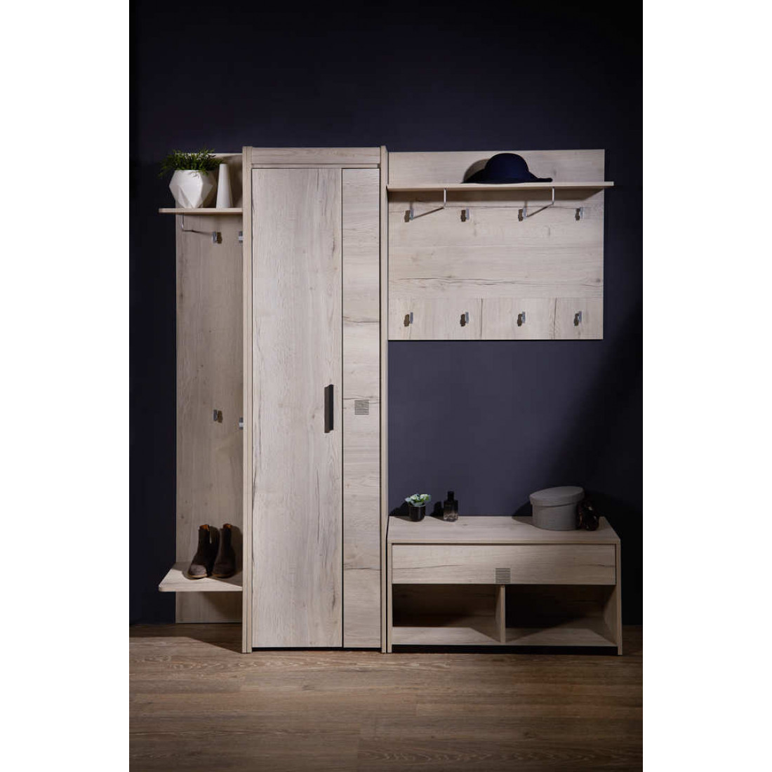 Прихожая «Мале» - обладательница лаконичного и свежего дизайна. Особое внимание привлекают тактильные ощущения от прикосновения к мебели. Декор и структуры, схожие с натуральным деревом по рисунку и шероховатости, придают глубину и естественность. Широкий спектр модулей позволит эргономично использовать Ваше пространство.
