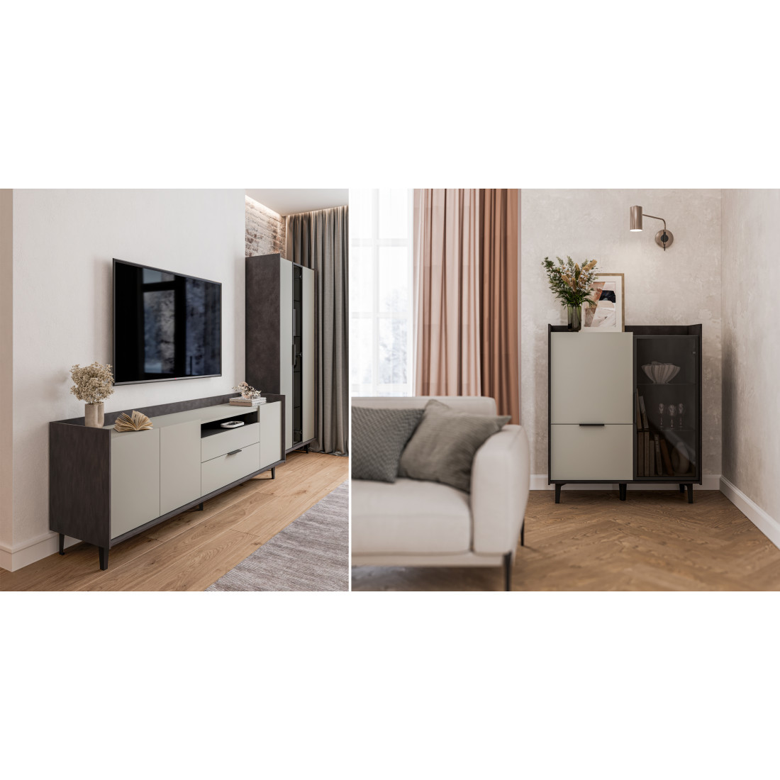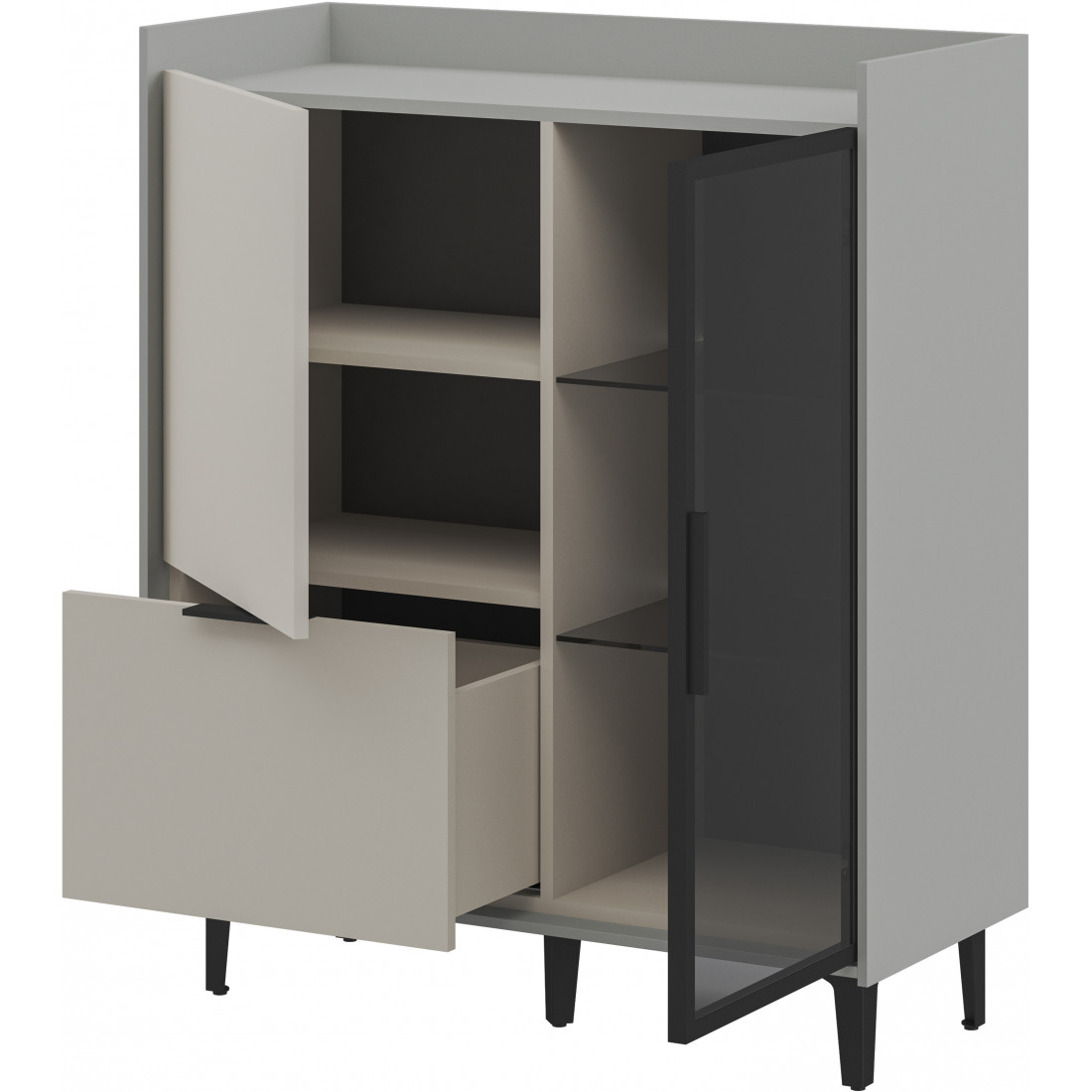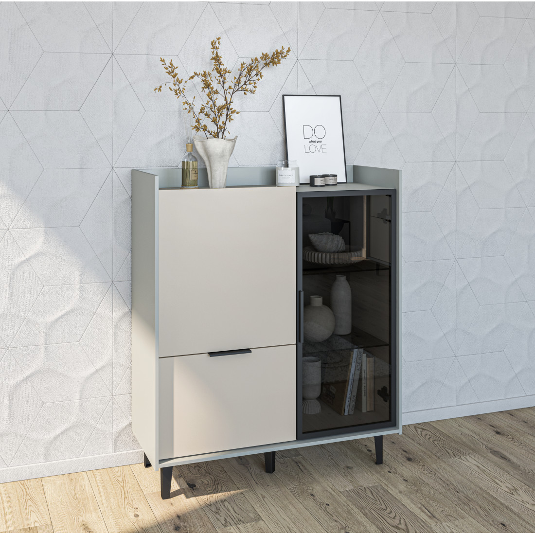 Шкаф Модена — это стильное решение для вашей гостиной с двумя уникальными отделениями. Подчеркните ваш дизайн, выбрав цвет из трех вариантов: Белый-Дуб Элисон, Лунный камень-жемчуг, Металл Бруклин-лунный жемчуг. Ножки из металла обеспечивают устойчивость. Первое отделение предлагает большой ящик и полки для удобного хранения разнообразных предметов, а второе — элегантные стеклянные полки и фасад из темного стекла, придающие шкафу изысканный вид. Шкаф Модена — идеальное сочетание функциональности и эстетики для вашей гостиной