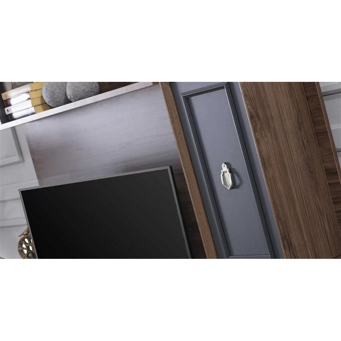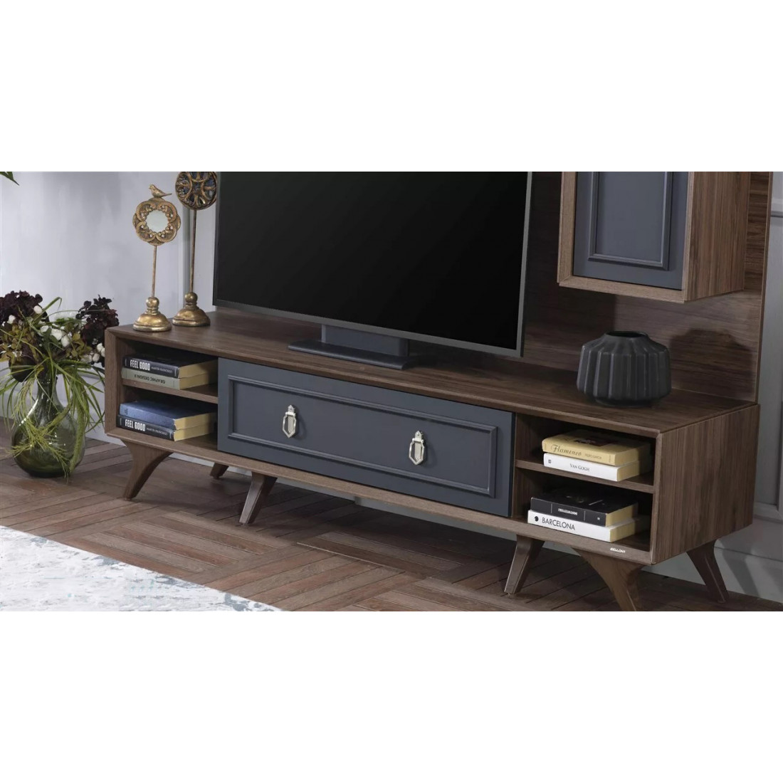 Тумба под ТВ в гостиную серии Алегро от Беллона станет прекрасным, многофункциональным дополнением интерьера гостиной. Ручки образуют единый декоративный элемент, сходясь в центре фасадов. В качестве материала для фасадов, столешницы и ножек использовался МДФ.