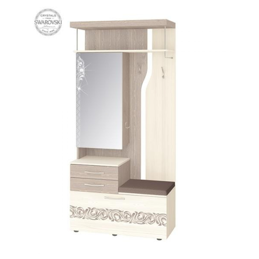 Комбинированная панель с крючками «Мэри 39.08» — элемент модульной программы прихожей «Мэри». Внизу модуля находится тумба для обуви с двумя вместительными полками. Европейская фурнитура Titus позволяет фиксировать откидную дверцу в любом положении. Тумба покрыта мягкой обивкой и выполняет дополнительную функцию сиденья. Ножки регулируются по высоте, что позволяет установить модуль на любой поверхности и скорректировать неровности пола.